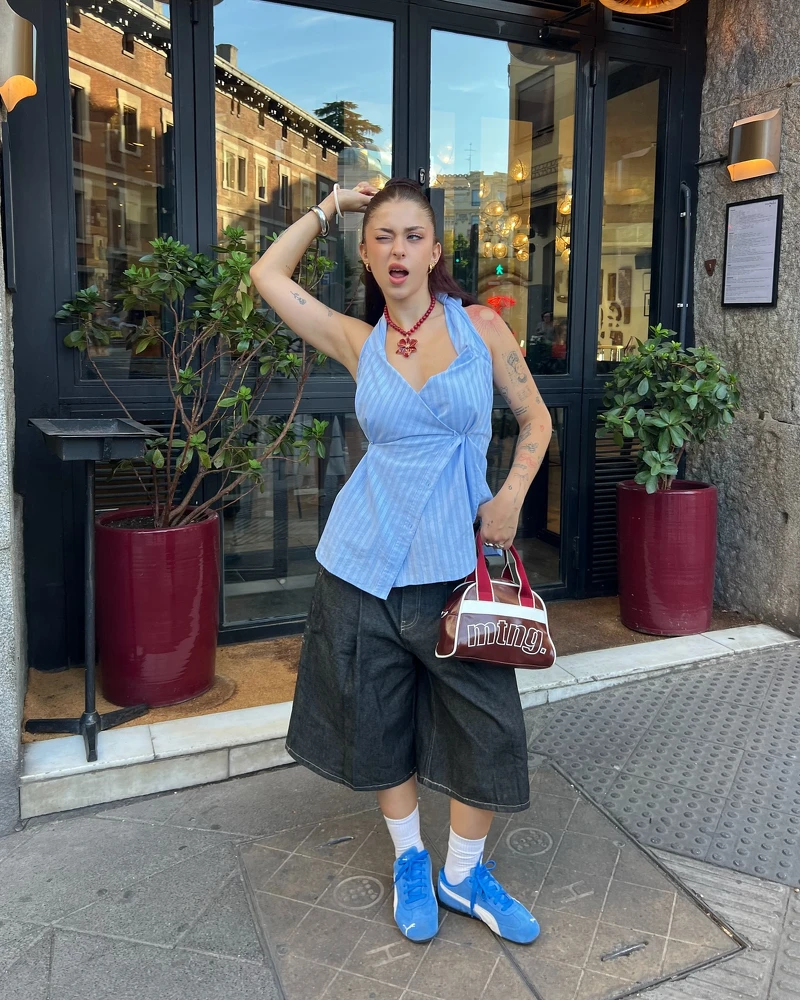 五分裤是炎炎夏日的穿搭首选,既能保留穿搭的通透度,又不会显腿短,搭配一双街头感十足的 PUMA 赛车鞋再适合不过。为了避免脚的份量感不足而造成视觉上头重脚轻,可穿长袜来改善,但建议露出一点肌肤更符合夏日氛围。