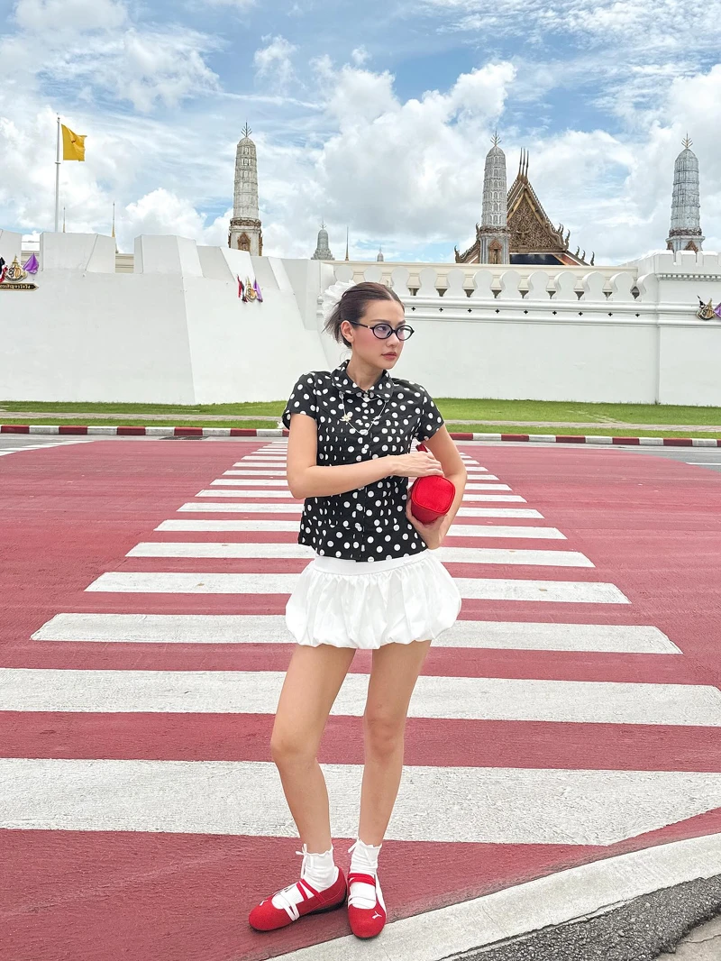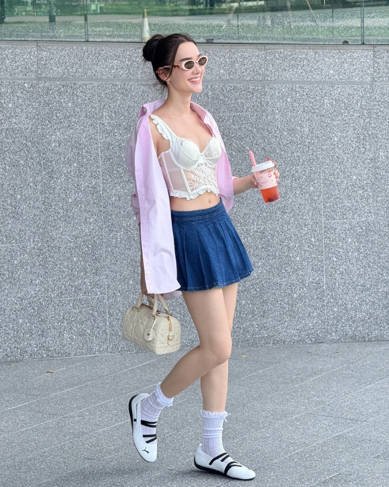 膝上短裙有修饰腿长比例的效果,搭配 PUMA Speedcat Ballet 不仅能跟上芭蕾舞鞋的趋势,还能为造型增添优雅气质与 Y2K 感。由于外型仍保留 Speedcat 的运动风格,所以整体不会过于甜美,而是在两者之间取得完美的平衡。