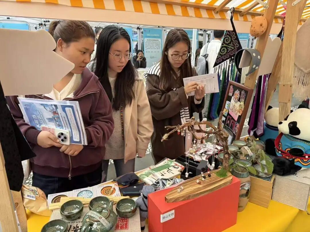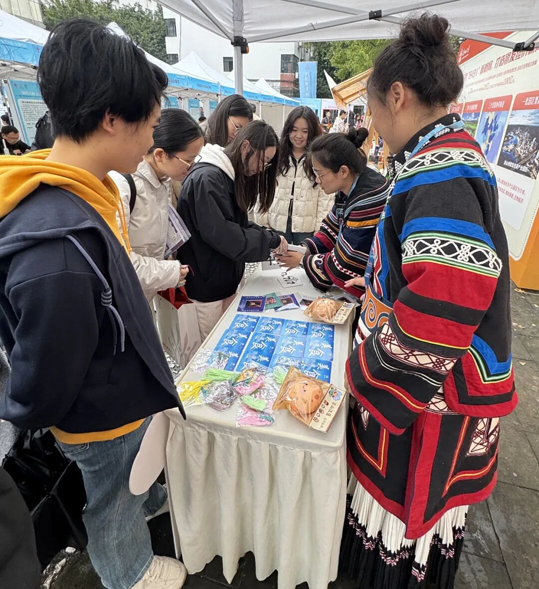 更令人眼前一亮的是,展区还陈列了融合彝族经典纹饰、邛海风光的日常文创产品:印着彝文图案的笔记本、缀有彝银巧思的零钱包……这些将“凉山元素”融入生活的创意好物,不仅展现了凉山人文风情的创新转化,更让学子们直观感受到“生活在凉山”的诗意与美好,不少人驻足观赏、细细询问,对这片土地的好奇与向往悄然萌芽。